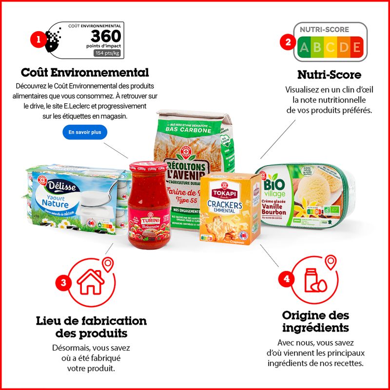 En cours de développement et d'expérimentation par le Ministère de la Transition Écologique avec l'appui de l'ADEME, ce score est désormais accessible sur le site E.Leclerc, ses drives et progressivement sur les étiquettes en magasins. Les informations sur l'origine et le lieu de fabrication sont aussi mises en avant et permettront d'apporter de la transparence aux consommateurs pour faire des choix en conscience, mais aussi aux producteurs de ces MDD et aux acheteurs pour améliorer l'offre.