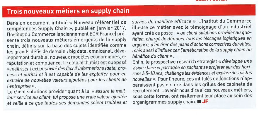 Trois nouveaux métiers en supply chain Lire l'article entier dans Supply chain magazine (avril 2019) Partager cet article sur les réseaux sociaux Partager sur LinkedIn